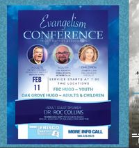 The Evangelism Conference will be held Wednesday, February 11, at 7pm. The Adults will meet at Oak Grove, the children at Oak Grove's Family Life Center. The Youth will meet at Hugo First Baptist Church.